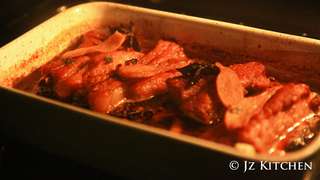 西式豬肋骨 ribs 是用燒或焗的方式。中式豬肋骨即是平日吃的排骨 (一字排),通常要蒸或炆。這次菜式是根據 Gordon Ramsay 的食譜修改了少許。用料揉合中西兩家的。中式有花椒、八角、蔥、薑、米酒;西式有 paprika、chili powder、white wine vinegar。味道方面有很多的層次,主要有花椒八角的獨特川辣、薑蒜的辛辣感、甜辣椒粉 sweet paprika 及辣椒粉的香辣、醋的酸、蜜糖的甜。經長時間的烤焗,豬肋骨吸收了各種的味道,混合了本身的豬油香,令人回味無窮!