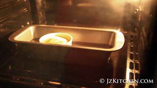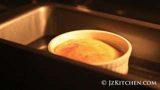 6. 把梳乎厘杯放上金屬烤盤,在杯子外面倒入熱水,水位約是杯子的一半高度。