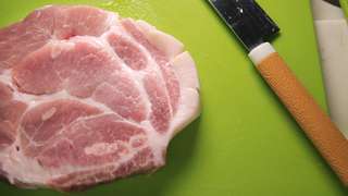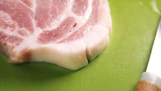 - 將豬扒外邊的脂肪劃上數刀,使脂肪層變成丁粒狀,避免煎豬扒時肉質收縮時曲起,使加熱不均。