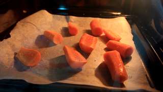3. 在焗盤上舖上牛油紙,放上甘荀,澆上少許橄欖油,撒上少許鹽,焗 20 分鐘。如期間發現甘荀已帶少許金黃,反轉一下。當小刀能輕輕刺穿甘荀,這代表甘荀已焗透,取出備用。